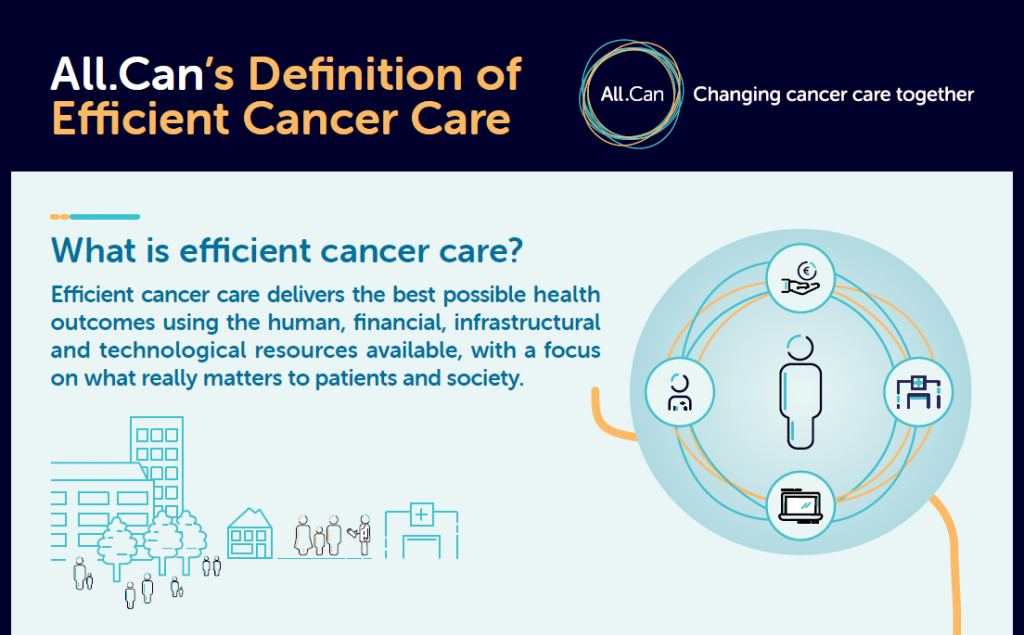 Η All.Can International παρουσίασε μέσω ειδικού γραφήματος με τίτλο “Definition of Efficient Cancer Care” την σημασία και τις δυνατότητες που μπορεί να προσφέρει στην ογκολογική θεραπεία η βελτίωση της αποτελεσματικότητας των διαθέσιμων πόρων, η οποία αποτελεί και βασικό πυλώνα – στόχο της διεθνούς πλατφόρμας.