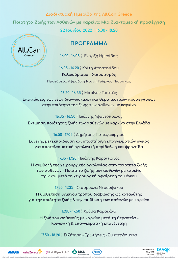 Η ανάγκη εστίασης της ογκολογικής περίθαλψης και φροντίδας στη βελτίωση της ποιότητας ζωής των ασθενών με καρκίνο και η σημασία της διεπιστημονικής προσέγγισής της, αναδείχθηκαν κατά τη διάρκεια της διαδικτυακής επιστημονικής ημερίδα της All.Can Greece, με τίτλο: «Ποιότητα Ζωής των Ασθενών με Καρκίνο: Μια δια-τομεακή προσέγγιση» και η οποία διεξήχθη την Τετάρτη, 22 Ιουνίου 2022.