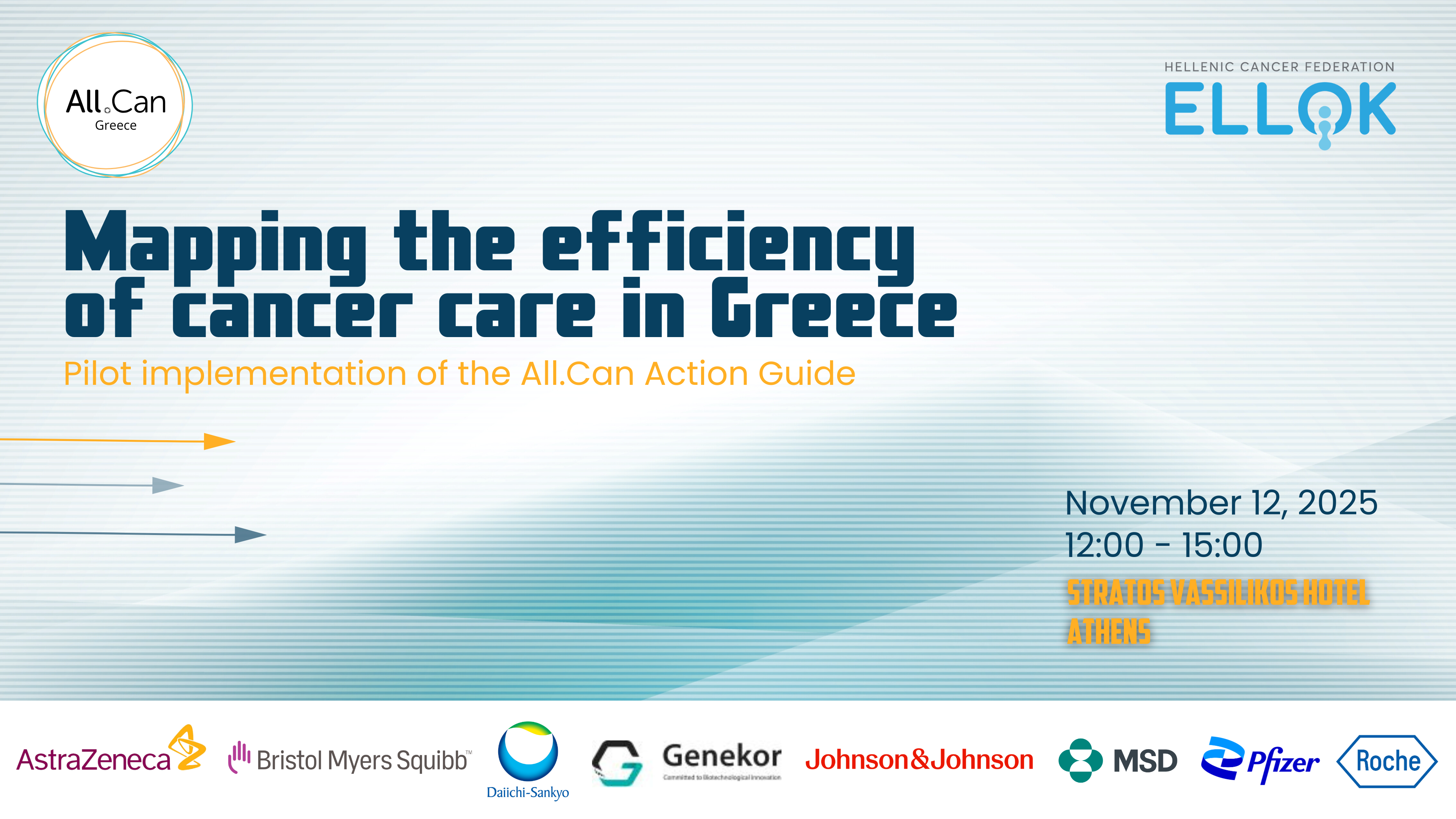 Η ογκολογική πλατφόρμα All.Can Greece, διοργανώνει ημερίδα με τίτλο “Mapping the Efficiency of Cancer Care in Greece: Pilot Implementation of the All.Can Action Guide” την Tετάρτη 12 Νοεμβρίου 2025 και ώρα 12:00-15:00, στο ξενοδοχείο Στράτος Βασιλικός στην Αθήνα (Μιχαλακοπούλου 114).